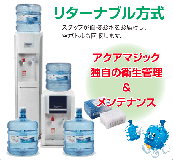 アクアマジックのリターナブル方式は毎月契約された日に当社専任スタッフがお水をお届けし空ボトルを回収します。
